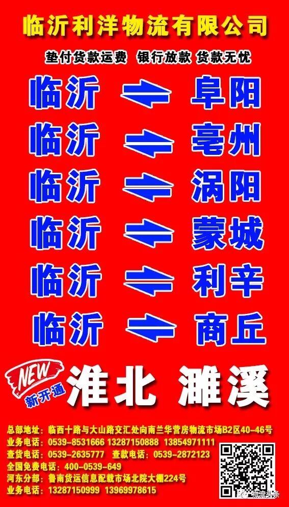 临沂利洋物流历经风雨十余载,以服务至上的经营理念,先后开通安徽阜阳、亳州、临泉、蒙城、利辛、河南商丘专线,为了更好的服务于淮北人民,特定于2018年2月23(大年初八)正式开通淮北,濉溪线路,欢迎新老客户前来洽谈业务淮北公司总经理范祥民,经理李梅将携程为您服务。
